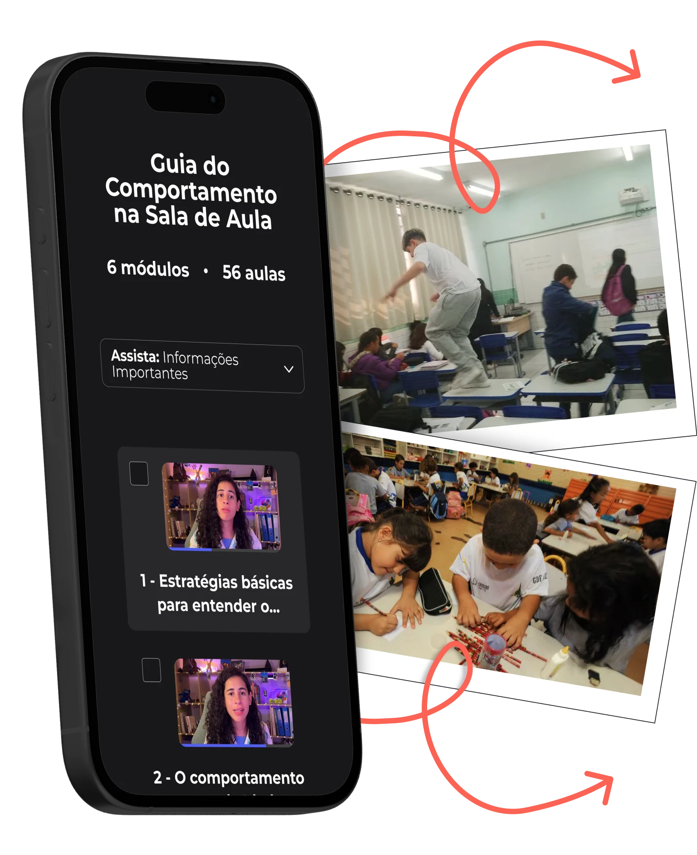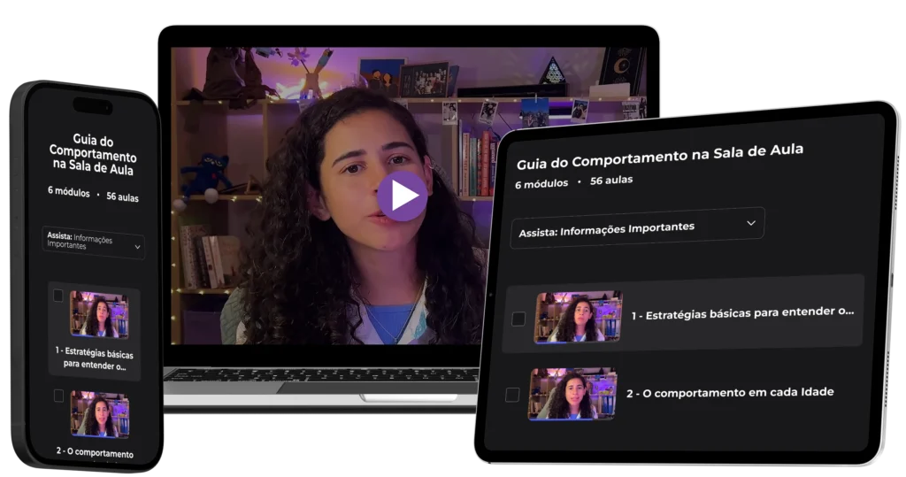É um material completo de apoio para professores, com aulas gravadas + PDF de consulta, criado para mostrar o motivo por trás dos principais comportamentos em sala e como agir em cada caso, de acordo com a faixa etária do aluno.